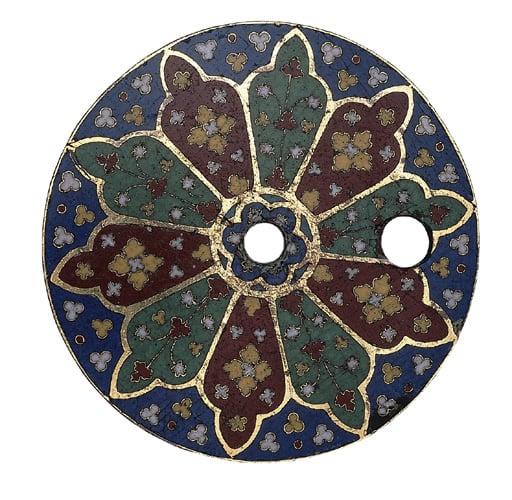Roundel with radiating tracery design and gilding. Blue, green, red and white and yellow enamel with one hole in the centre and one hole towards the rim.