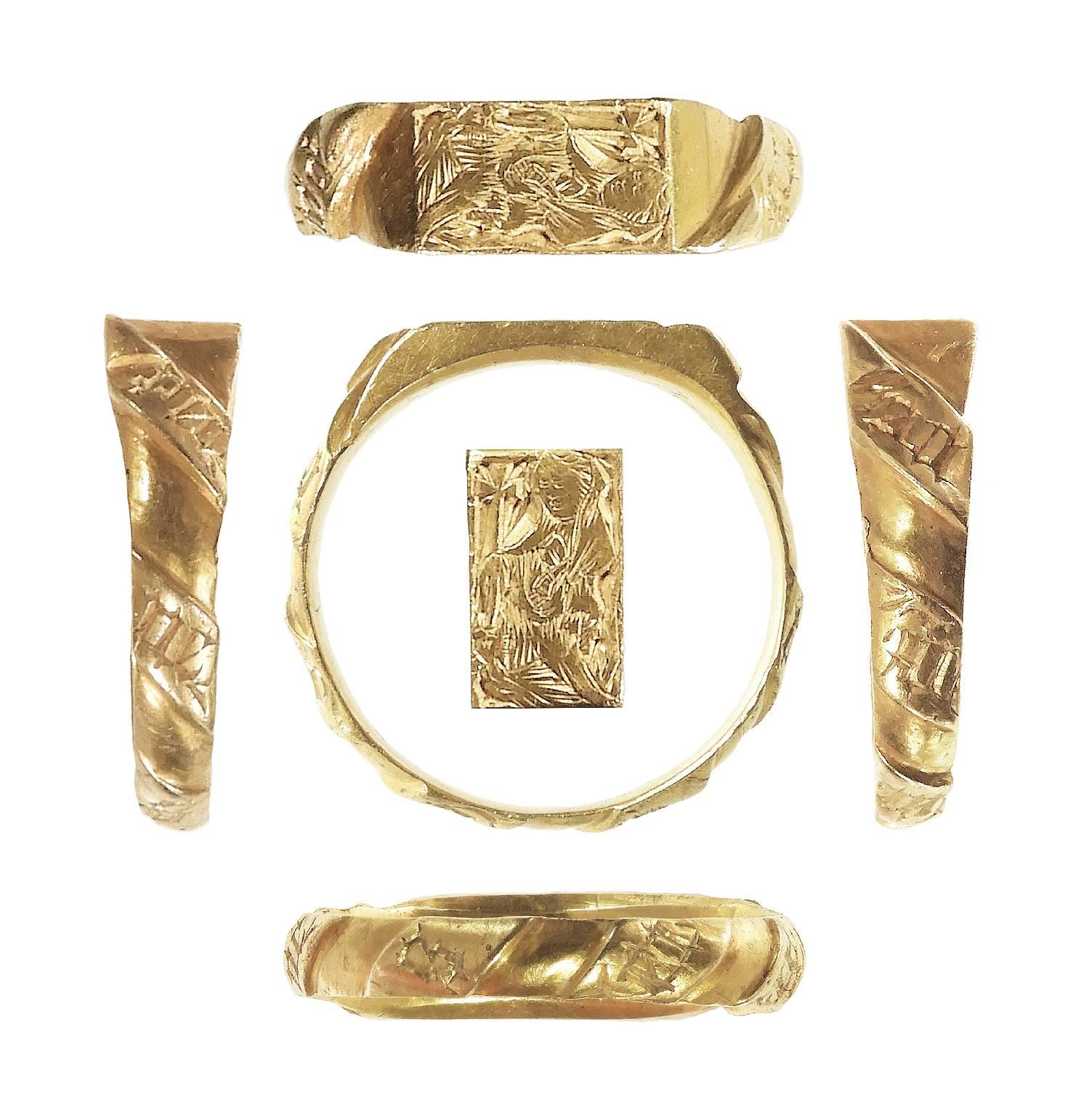 An engraving of St Margaret of Antioch spearing a dragon appears on the bezel of this medieval gold ring, which was found by a metal detectorist on the Isle of Wight in 2018.