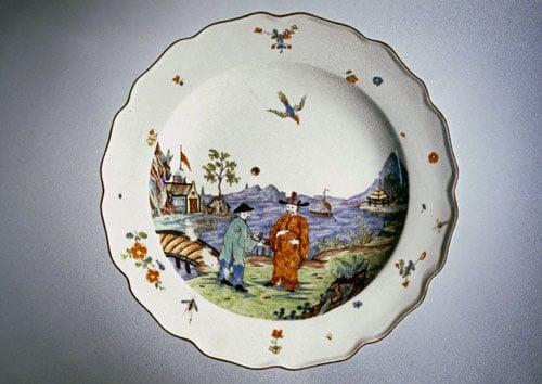 A porcelain plate painted with chinoiseries. One of two gifts to two museums by L C G Clarke through the Art Fund in 1955 and 1958.