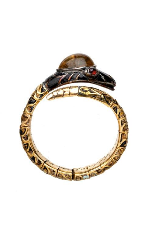 1) Ring commemorating the death of Hannah, wife of Nathan Meyer de Rothschild. The ring is segmented in the form of a snake, with black enamel on gold and a yellow sapphire on the head (main illustration). 2) Brooch commemorating the death of Nathan Meyer de Rothschild, founder of the London firm of that name and financial agent to the Government during the Napoleonic wars. It is lozenge shaped and contains a round agate in a snake setting. One of four gifts to three museums by Rupert Joseph through the Art Fund between 1934 and 1941.