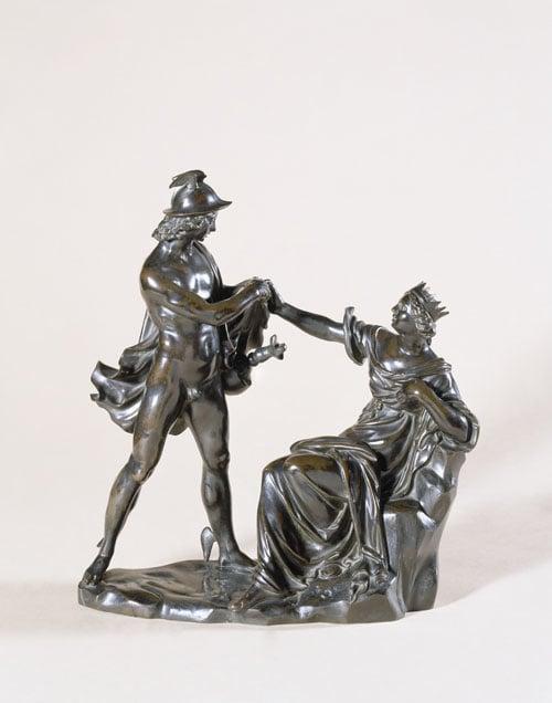 Mercury, holding a vase, stands before a seated and crowned female figure. The title is derived from the French Royal Inventories, but the subject is obscure.