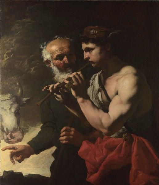 Mercury, in a winged cap, is playing a pipe to Argus, a grey-bearded old man in a dark dress who bends towards him, fascinated. On the left appears the head of a white cow, the transformed Io, with dark sky above and light below, over a rocky horizon.
