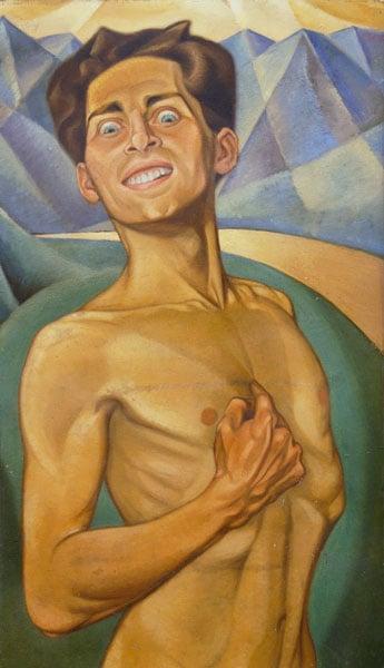 Half-length self-portrait by the Austrian artist Ernst (later anglicised to Ernest) Neuschul, immediately arresting because of the unnerving, glittering stare aimed directly at the viewer. It has an almost manic visionary quality and dates from the period between 1919 and 1926 when he painted self-portraits, sometimes in sparse interiors or placed in lyrical dreamlike landscapes, all in various states of self-absorption. The artist was influenced by the prevailing post-war New Objectivity (Neue Sachlichkeit) movement.