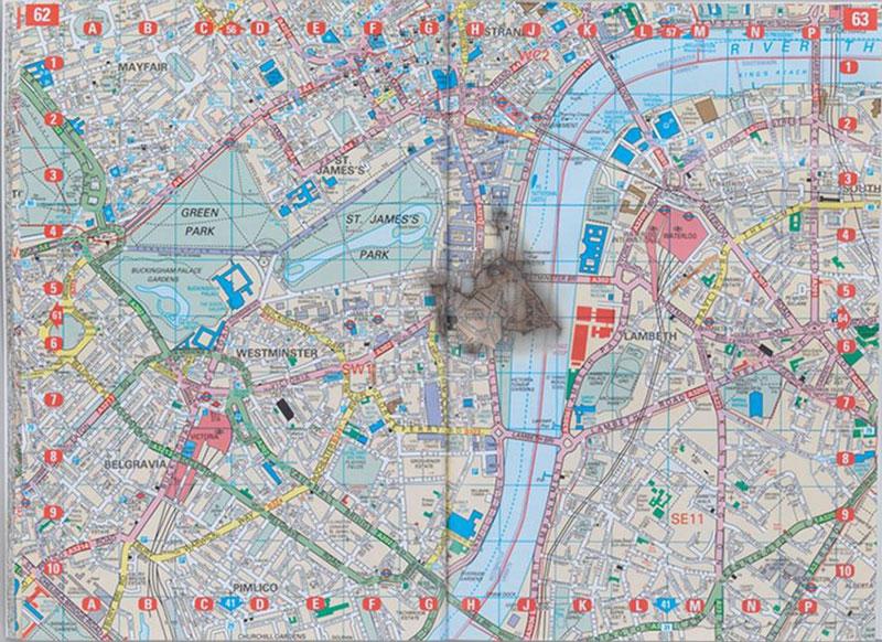 Cornelia Parker’s Meteorite Lands on the Houses of Parliament is a conceptual work contemplating the apocalyptic power of nature. Parker made the piece by heating up a fragment of a real meteorite and placing it on a map to create a charred hole on the site of the Houses of Parliament.