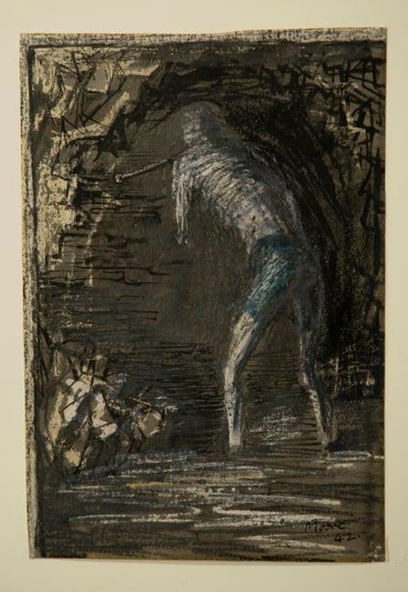 This work dates from Henry's Moore's time as an official war artist in the Second World War. During this period he produced some of his most powerful and moving drawings. After he had completed the Shelter drawings of 1941, studies of Londoners taking refuge from the Blitz in the underground, he visited the Wheldale Colliery in his home town of Castleford in West Yorkshire, where he recorded the miners at work. Mining was a reserved occupation during wartime and Moore was himself the son of a miner.