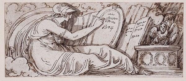 Minerva sits on the ground with legs extended, writing on a tablet. She wears a flowing gown, sandals amd a helmet. At her feet are symbols of the arts including a book, an artist's pallette and a bird on a pedestal.
