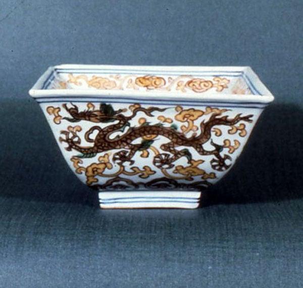 Slab-built bowl. Marked with the six-character mark of the Jia Jing Emperor of the Ming dynasty, and decorated with dragons and clouds.