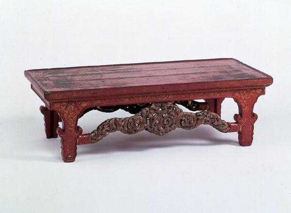 It is covered overall in red lacquer which is then decorated in the 'qiang jin' incised gold technique, whereby the pattern is incised with a sharp point and subsequently filled in with gold leaf.