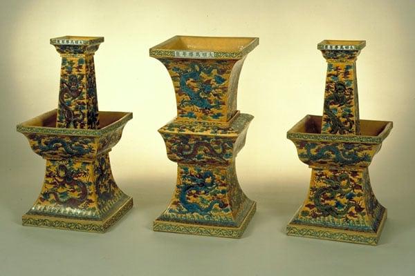 1) Beaker shaped vase; 2-3) two pricket candlesticks. All objects from an imperial altar set at Hsi Ling (?). Enamelled porcelain with imperial dragon designs and the mark of Wan-Li period, 1573-1619.