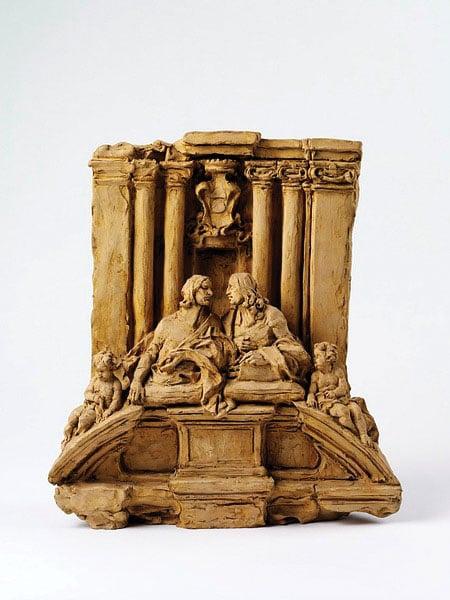 Clay model for a tomb of two brothers, Pietro and Francesco Bolognetti in the church of Gesu e Maria in Rome. Two half-length figures lean on a curved parapet with two putti. Behind: a coat of arms in a niche between columns.