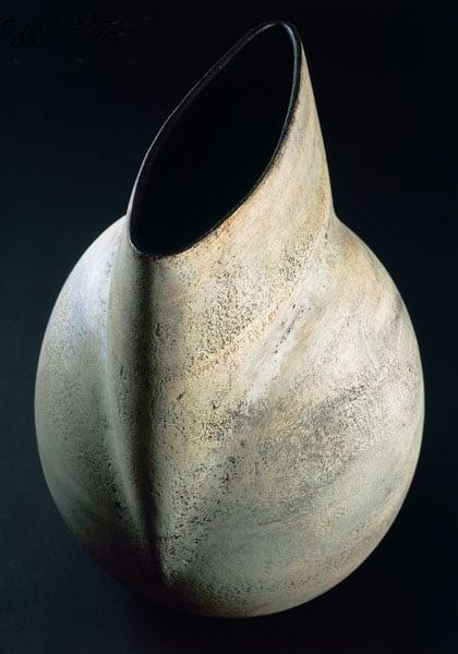 A large vase with spherical base and flattened cylindrical neck. Brown and cream glazes. Part of the original ceramic collection of Lady Sempill, the castle's last resident, which also includes works by Lucy Rie and Bernard Leach.