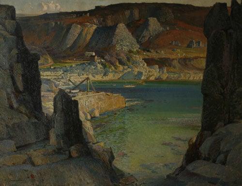 This is one of the artist's largest and most dramatic paintings and depicts Lamorna Cove and quarry seen through pinnacles of granite. In the centre is the old harbour wall with its derrick used for loading the quarried stone onto ships. This view of the cliffs and sea at Lamorna Cove is topographically accurate albeit from an unusual viewpoint. Although the artist was not a Cornishman by birth, he lived most of his life in Cornwall and much of his work depicts Cornish views.