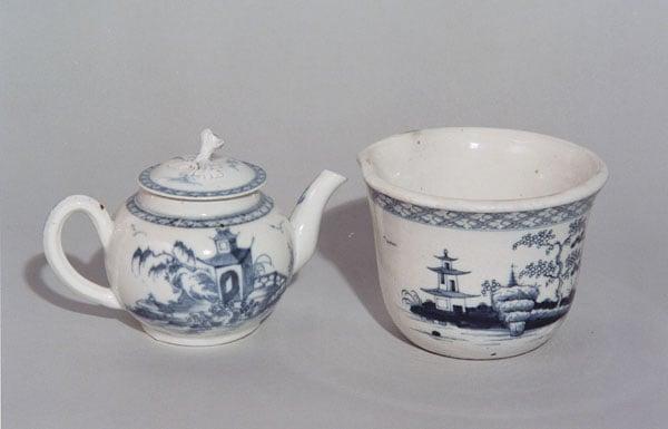 1) The Mortar bears the Plymouth mark in blue on the base and the wreathing caused during the modelling is a familiar characteristic of many Plymouth pieces; 2) Small globular teapot decorated in blue on white. The decoration is oriental in character with a blue band running round the edge of the lid and the neck of the teapot.