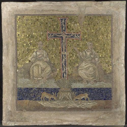 In the centre a Crucifix of strong blue, edged with white and red, and on the blue twelve white doves. On the left, St Peter; on the right St Paul, both seated. Four rivers, 'The Water of Life', flow from the foot of the Cross.