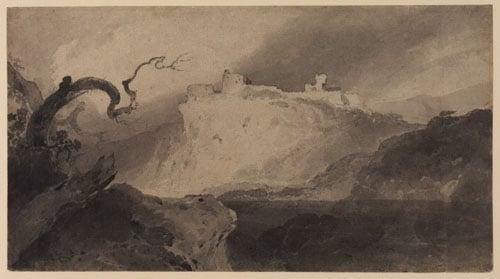 This drawing was probably made by Cotman in 1800 when he was staying with the bookseller Joseph Cottle at Bristol. Cottle had recently published the poems of Robert Southey, and it was Southey's lines which inspired this dramatic composition: High on a rock whose castle's shade Darkened the lake below In ancient strength majestic stood The Tower of Arkinlow.