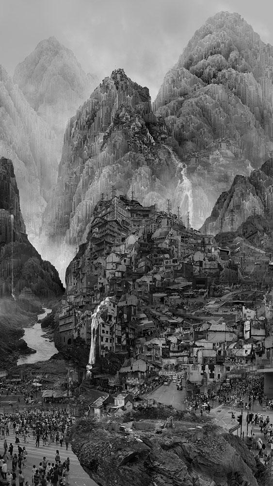 Yang Yongliang’s video work Mountains of Crowds shows throngs of people moving through an urban landscape set against a view of distant mountains and waterfalls. On close inspection, the mountains are revealed to be made up of densely packed skyscrapers.