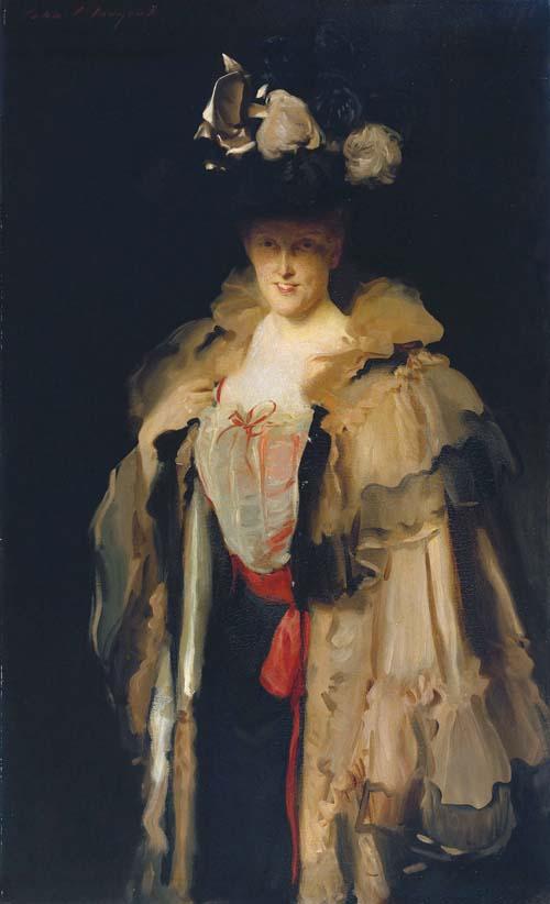 A portrait of Mrs Charles Hunter wearing a low-cut black dress with cream coloured underbodice, red ribbons, red sash, an evening cloak of apricot and black chiffonbwith white satin lining, a black hat with black and apricot feathers and ribbons. Her right hand is raised and holds back her cloak.