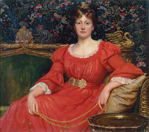 Opulent portrait of Elfrida Elizabeth Bird (1848-1928), wife of Luke Ionides (1837-1924), epitomising Aesthetic taste. The sitter wears a salmon pink silk dress with a silver gilt buckle at the waist decorated with fretwork including the figures of Faith, Hope and Charity (the original buckle is currently on loan to the museum). She holds a 'Tesbih' string of amber beads which, along with the mother-of-pearl inlaid dark wood table in the right foreground, may be a reference to the Ionides' Middle Eastern origin. Elfrida sits on an Empire-style sofa (the height of Aesthetic fashion) behind which is a screen of patterned Japanese kimono silk (of which the museum has several comparable examples).
