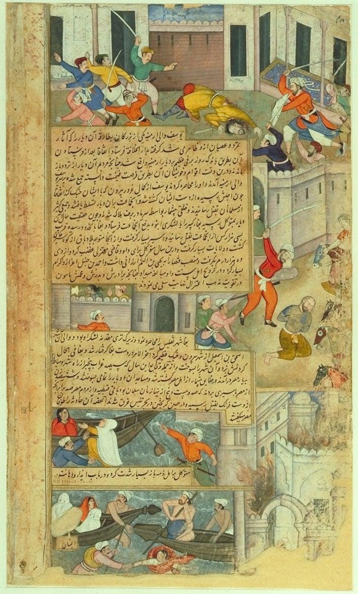 Mughal illuminated page from Ta'rikh-i Alfi, a history of the world. The imperial copy made for the emperor Akbar's library. Attributed to Basawan. All the scenes are of violence on this leaf but a ploughing scene has been added in the margin.