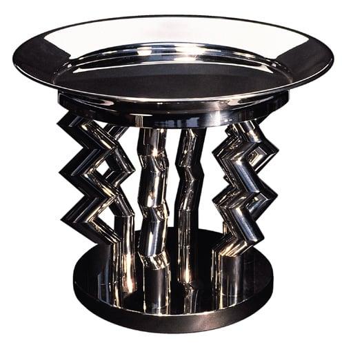 Fruit stand with a wide circular dish top with an inset circular panel supported by 6 zigzag legs which are in turn supported by an unadorned circular foot.