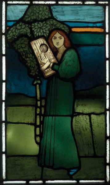 David Gauld was an important Glasgow artist and designer. His most distinctive paintings and prints were often graphic and decorative in character, so it is no surprise that he took up stained glass design in the late 1880s. Greatly influenced by Japanese art, Gauld became the first Glasgow artist to begin the process of abstracting the human figure, moving away from the naturalistic treatment of the preceding generation of artists towards the stylised two-dimensional designs that culminate in the work of Charles Rennie Mackintosh, the Macdonald sisters and Jessie Marion King. In this piece the simplicity of the figure and the landscape comes to the fore. Gauld began working with the Hugh McCulloch studio in 1891 – a studio that would go on to produce some of the most celebrated Glasgow leaded glasswork ever made, for Mackintosh’s Willow Tea Rooms. For McCulloch’s, Gauld designed a set of eight panels for the bay window of a Glasgow music room, each of which featured a woman playing a musical instrument. This panel could have been made for the series, or for another ‘Music’ series for an as yet unknown house.