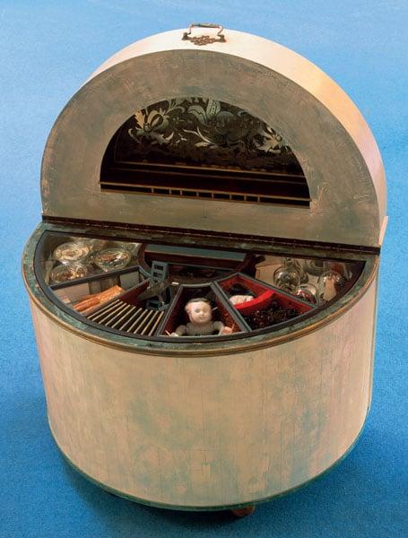Large semi-cylindrical wooden music box by Graham Gingles. It opens at the top to reveal compartments containing assorted strange and evocative objects, including a model plane, a model hand, a doll, and assorted memorabilia. Some are glassed over whilst others can be touched. The items assembled by the artist are auto-biographical but are intended to elicit the viewer's own particular memories, as well as exploring ideas of identity in terms of family and place. Opening the box starts a six minute soundtrack composed by Elaine Agnew which weaves together speech (local children and adults talking about childhood memories) and music from the original music box which inspired the piece, inherited by Gingles from his aunt. Purchased by the Art Fund with the assistance of the Esmée Fairbairn Foundation.