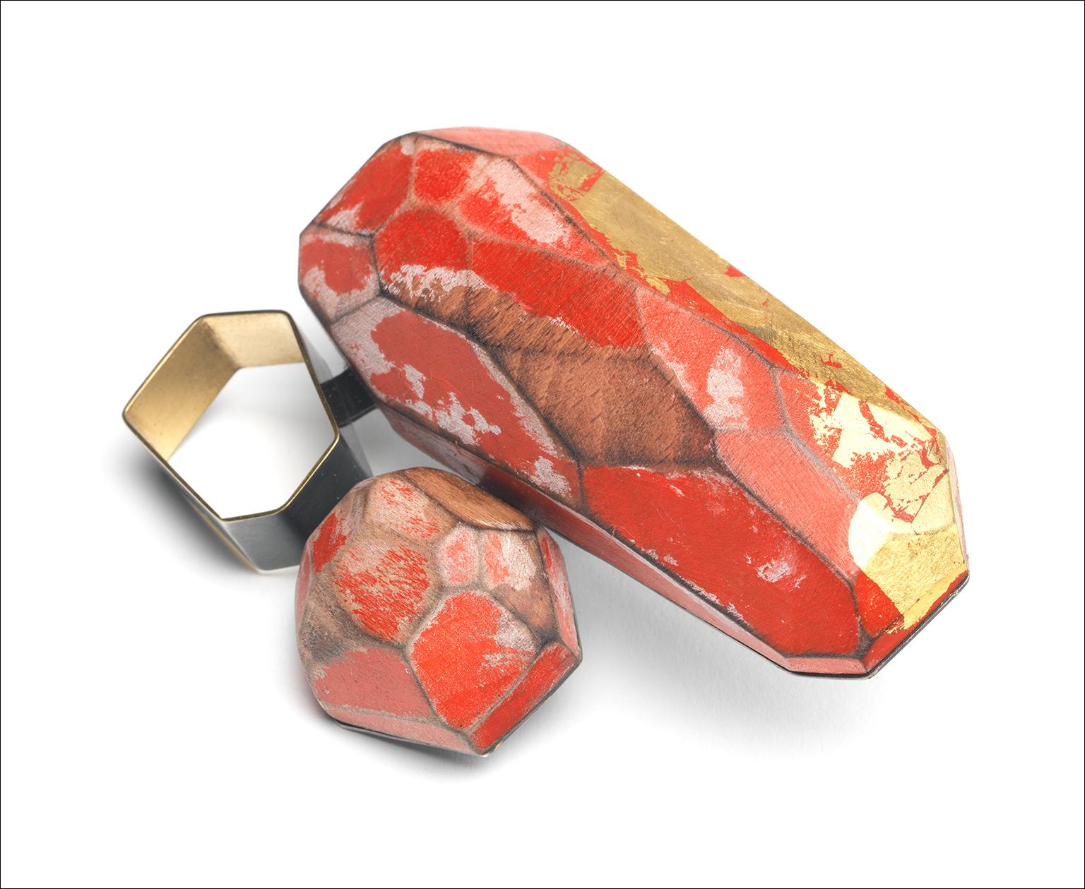 Wood, Various: gold plated silver, wood, acrylic paint, gold leaf, stainless steel nylon coated cable