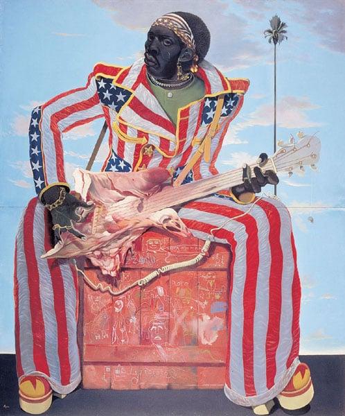 Depicts a black rockstar dressed in a suit decorated with stars and stripes with high heel platform shoes sitting on a wooden crate playing an electric guitar.
