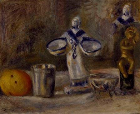 An unusual subject for Renoir, showing a porcelain figure of a country-girl with paniers reflected in a glass, with a piece of fruit on the ledge beside it. This painting was part of a collection of 9 works bequeathed to the Ashmolean.