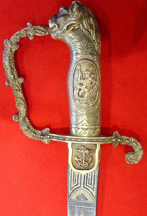 This sword was presented in 1814 by passengers on board the packet ship the 'Duke of Marlborough' to Mr William Macdonnell, the ship's Master. Its inscription records that it was awarded for gallant conduct under his Captain, John Bull, in action against the British Royal Navy frigate the 'Primrose' in a wartime friendly fire incident in the Bay of Biscay in March 1814. As with other swords of the Napoleonic War period it is decorated with appropriately nationalistic and heroic symbolism such as a British lion-head pommel and engravings of Neptune and the Labours of Hercules.