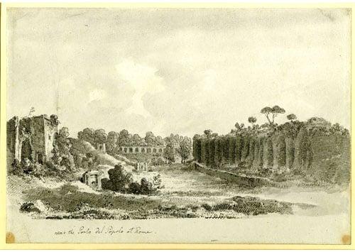 A depiction of the Porta del Popolo in Rome showing an area of flat land enclosed on one side by a tall screen of trees with a mound with scattered ruins on the left side and a viaduct and trees at the far end. One of a group of 6 topographical drawings by Edmund Becker presented to the British Museum by Archdeacon F H D Smythe through the Art Fund in 1948.