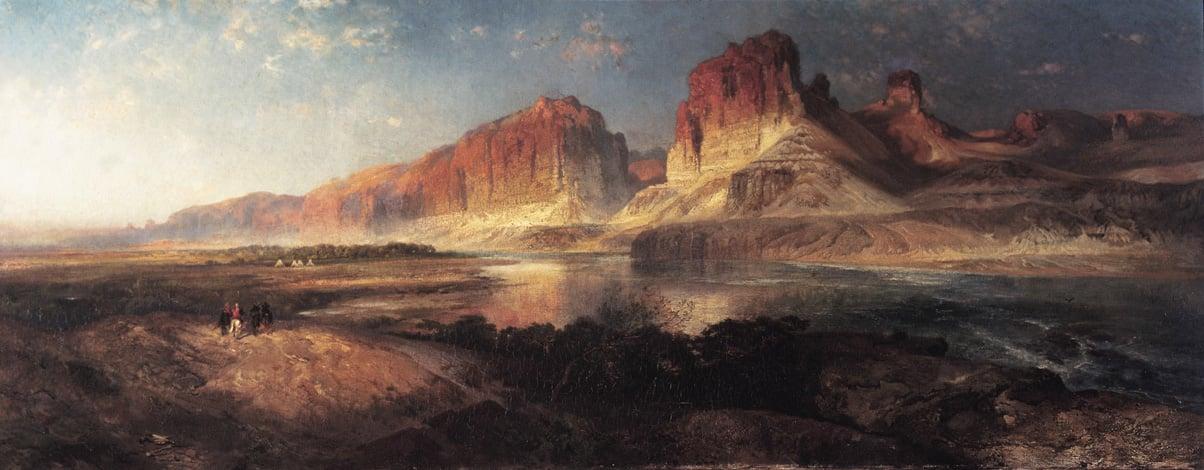 Moran was born in Bolton in 1837 and emigrated to America in 1844. During his lifetime he became one of the most influential 19th-century American painters. Moran retained links with Britain, and specifically Bolton, throughout his life. Strongly influenced by Turner and other British landscape artists, Moran sought to establish a reputation in Britain bringing an exhibition of his works, including Nearing Camp, Evening on the Upper Colorado River, to Bolton and London in 1882. The Green River (also referred to as the Upper Colorado River) was a motif Moran returned to regularly throughout his career, with the variations he produced selling well into the 20th century. Moran's Green River paintings presented the public with a highly romantic vision of the American West. with dramatic cliffs overpowering the Indians on horseback that he often included.