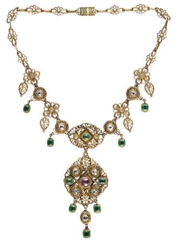 Silver gilt; pink sapphire; green chalcedonies; aquamarines