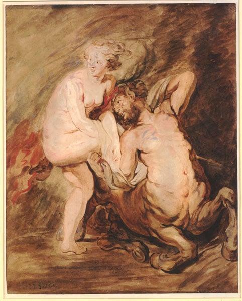 A naked woman and a centaur. A copy of a painting by Rubens. Inscription: PP Rubens added later.