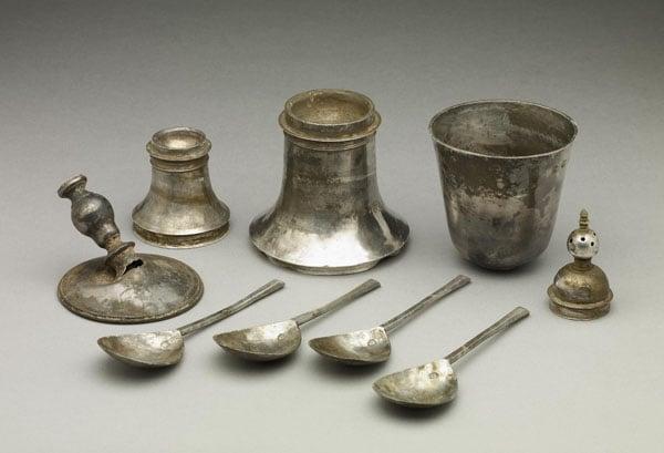 This hoard consists of four slip top spoons, a goblet and a bell salt and was almost certainly hidden for safekeeping in the 1640s during the English Civil War. The hoard lay close to a royalist garrison at Stowey Court and may have been owned by its occupants or, perhaps more likely, a prosperous local yeoman. The objects were all made in London, including three spoons by the specialist spoon maker John Feake. Feake served his apprenticeship with Somerset-born silversmith Daniel Cary. The bell salt is a particularly rare survival and interesting as it was made by two different makers at different times.