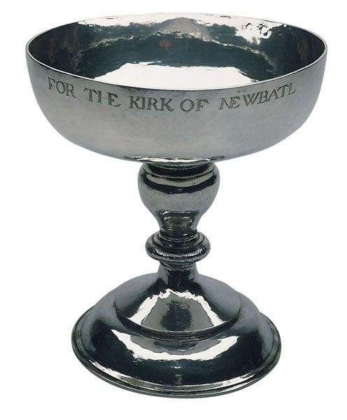 Cup with shallow broad bowl engraved at the lip with 'For the Kirk of Newbatl'.