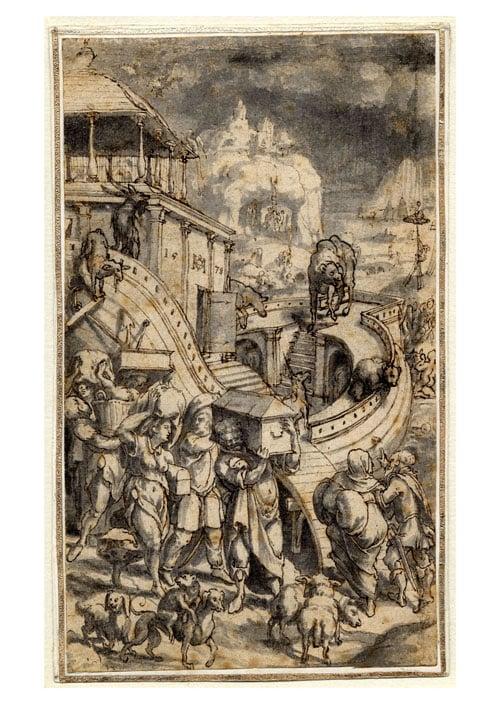 Noah's Ark: animals and figures climbing aboard the Ark with a hilly landscape in the background. This is one of 111 drawings bequeathed to the British Museum by Rosi Schilling in 1997. The majority of this collection of drawings formed by Dr Edmund Schilling was bequeathed to the British Museum through the Art Fund by his widow, Mrs Rosi Schilling, in 1993. Schilling was a former curator of the Stadelsches Kunstinstitut in Frankfurt, who emigrated to England in 1937. He was one of the few acknowledged specialists in this country on German graphic art, and built up his collection during the 1940s and 1950s in London when, Northern drawings were unfashionable and could be bought relatively inexpensively. His collection included drawings by major artists such as Hans Baldung and Lucas Cranach.