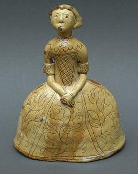 North Devon sgraffito slipware figure of a lady in a crinoline. Made of red clay, wheel thrown with the head, cap and cuffs added. Incised floral designs. Potters initials: E B. Possibly Edwin Beer Fishley of the Fremington Pottery.