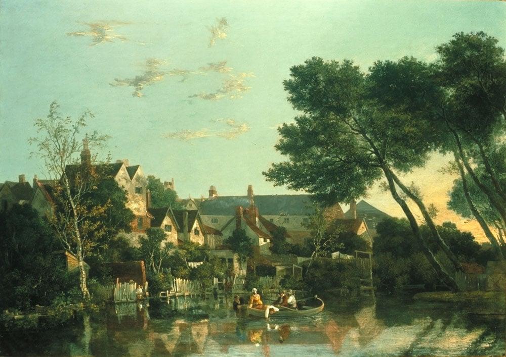 John Crome spent his life in Norwich working mainly as a drawing master and playing a key role in the Norwich Society of Artists. This tranquil summer scene was painted on the River Wensum, probably near the New Mills at St Martin's at Oak, not far from where Crome lived. Crome's abiding interest in capturing the effect of sunlight and atmosphere can be clearly seen in this work - particularly his use of the drift of smoke from the chimney to provide atmosphere. The order and lucidity of the composition is characteristic of his mature work.