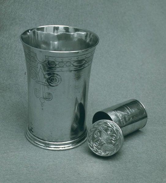 1) Cylindrical beaker, circa 1680, Robert Osborne. Marked with; Norwich mark, maker's mark & monogram RO. 2) Counter box & cover for silver gaming counters, c.1680, by Thomas Havers. Both pieces are decorated with simple bold ornament. Plate was only assayed in Norwich 1565-1700.