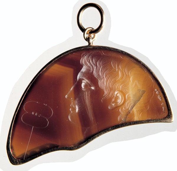 Octavian is shown in profile as Mercury with delicately engraved hair and features. An unidentified symbol is seen on the left side of the gem.