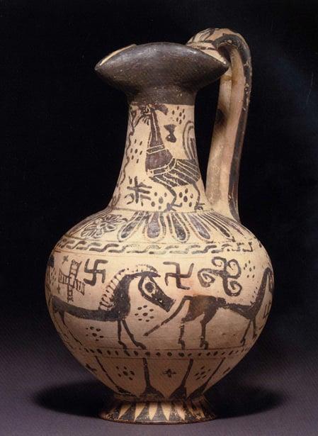 This jug was made on one of the Greek islands, probably Skyros. It is one of only a very small group of similar pieces and the first example to enter a British collection. The decoration of this vase combines silhouetted winged horses in a sub-Geometric style and filling ornaments with a pair of cocks on the neck in the so-called black-figure technique.