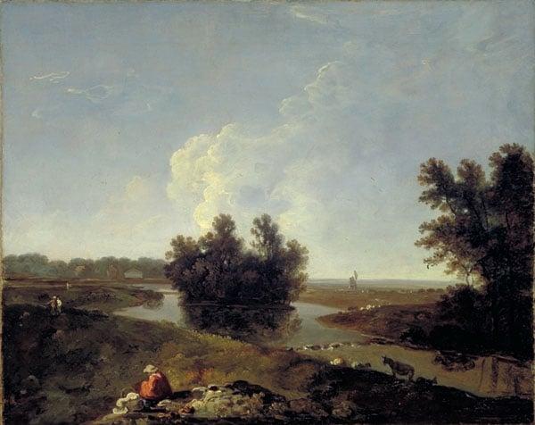 Depicts a river and banks on Hounslow Heath and etched at Hastings.