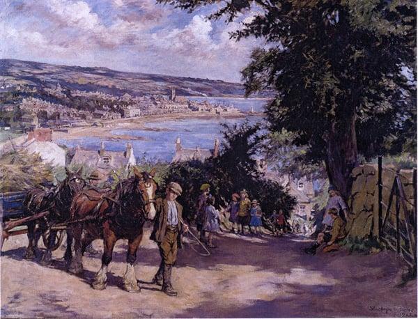 This is a major late work by Stanhope Forbes, a leading member of the Newlyn School, and a superb example of 1920s painting in Britain. Influenced by French 'plein air' painters, the artist painted this view from the junction between Chywoone (or 'Paul') Hill and the top of Adit Lane in Newlyn, West Cornwall, a view still recognisable today. In the distance is Penzance, with St Mary's Church and the Queen's Hotel prominently visible. The work epitomises artists' concern with depicting a return to normality after World War I and celebrating the conservative values of rural village life.