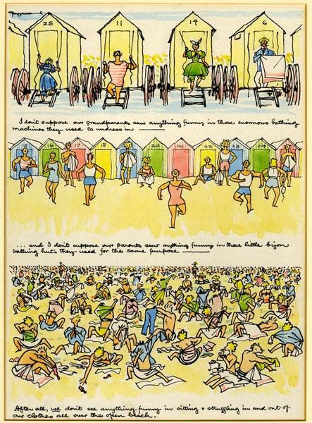 Kenneth Bird ‘Fougasse’ was a leading and influential British cartoonist and illustrator of the mid-20th century. He was art editor and later editor at Punch and wrote an influential study of 20th century cartooning, The Good-Tempered Pencil. He is most famous for the posters designed for government departments including the influential ‘Careless Talk Costs Lives’ series which the V&A acquired with an Art Fund grant in 2006. This work was produced for the 1954 Summer edition of Punch. The cartoons shows how the British have dealt with the problem of changing into bathing suits through the ages.