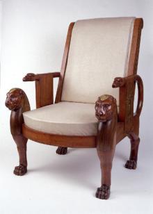'Egyptian' style chair, related to a design published by Baron Dominique Vivant Denon (1747-1825). It is known that Denon possessed a version of a small statuette of Napoleon by Antoine Mouton showing the Emperor sitting in a chair of very similar form. This chair is one of a pair, the other one was acquired by the Walker, Liverpool with the same grant.