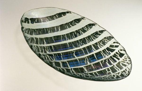 The artist has developed a kiln-fused technique using glass cut into strips and painted with oxides to produce iridescent colours. On this piece the black is painted then combed with the printing block.