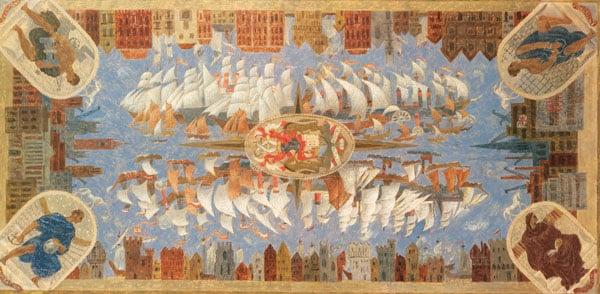 The ceiling design depicts buildings in Bristol at the edge and the centre details sailing ships from different periods of Bristol History. The four corners show the allegorical figures of Enterprise, Wisdom, Industry and Navigation. In the final version the buildings are far more recognisable as Bristol buildings than in this original design.
