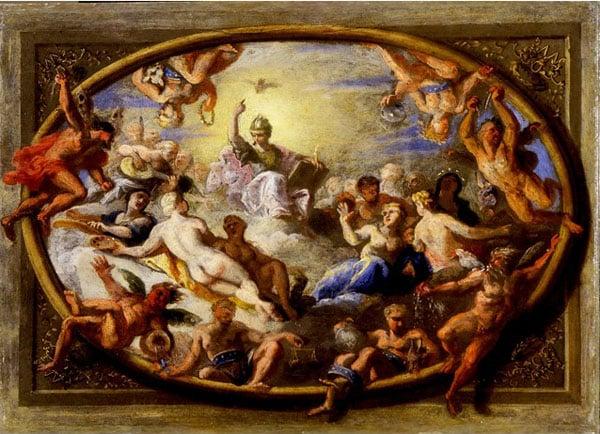 Original sketch in tempera for the ceiling of the Banqueting Hall at Hampton Court: Minerva surrounded by allegorical figures. Royal monogram W R.