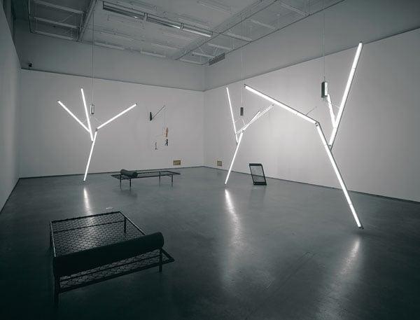 The installation consists of three tree lights, one small black bin, two daybeds, one mobile and five ventilation grills. The installation triggers memories of teenage evenings in parks and captures the mood and melancholy of early evening in the city or the suburbs. The mobile has parts hanging from it that were originally made and designed by Charles and Ray Eames.